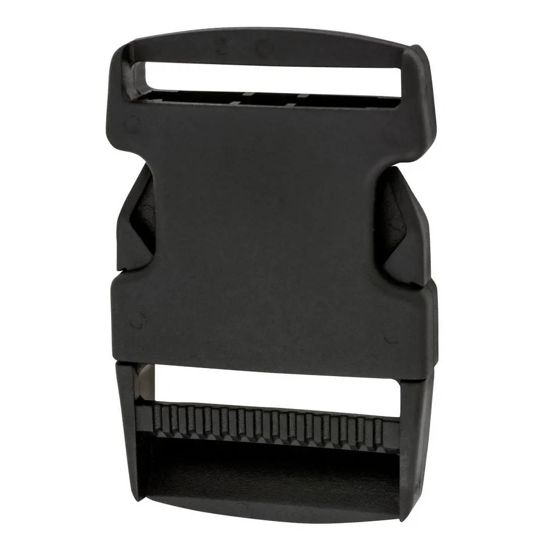 Plastic/nylon side release buckle for use on bags and pet wear. Measurement indicating what width strap they can accommodate.