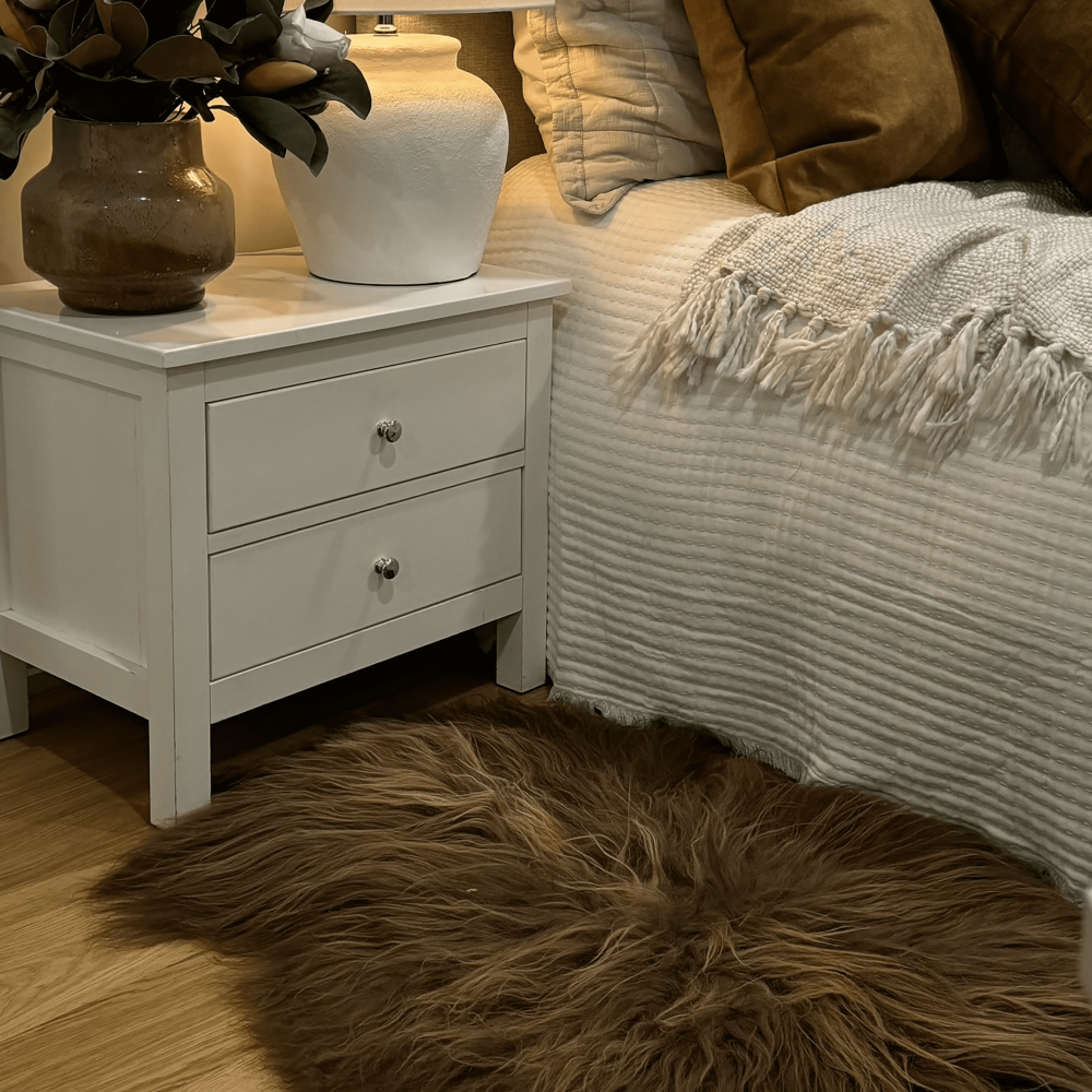 These Icelandic rugs are made up of one and a half skins and provide extra length for draping over furniture or using as a floor rug. Approximately 157cm long but please note this is a natural product and each hide will differ slightly in size and shape to the one pictured.
