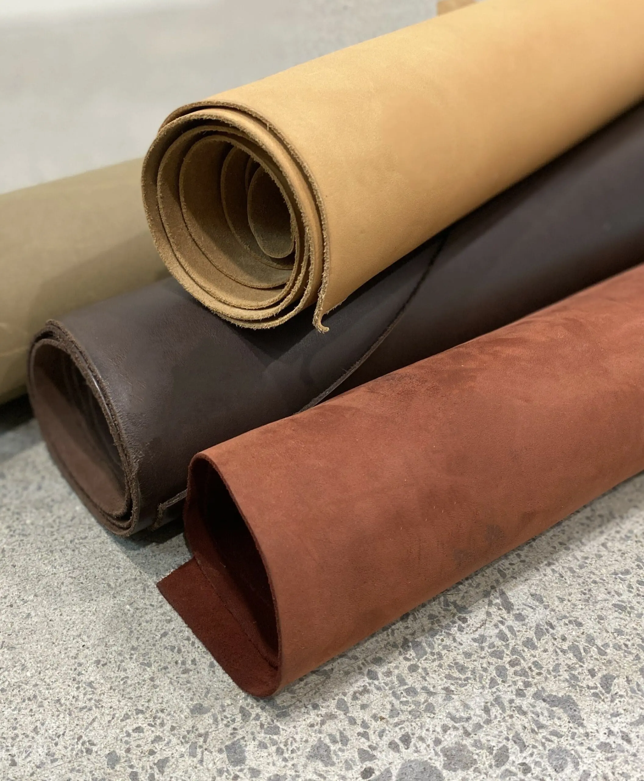 An assortment of industrial leathers from Tasman. This product is sold by the hide, priced per square foot. Each hide averages 20sqft (minimum 17sqft, maximum 22sqft). You may request a small or large hide in the order notes in cart.
